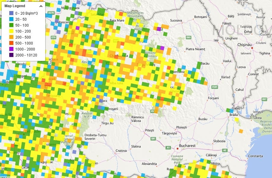 Harta radonului din Romania 2018 – Sursa: Centrul comun de cercetare al Comisiei Europene