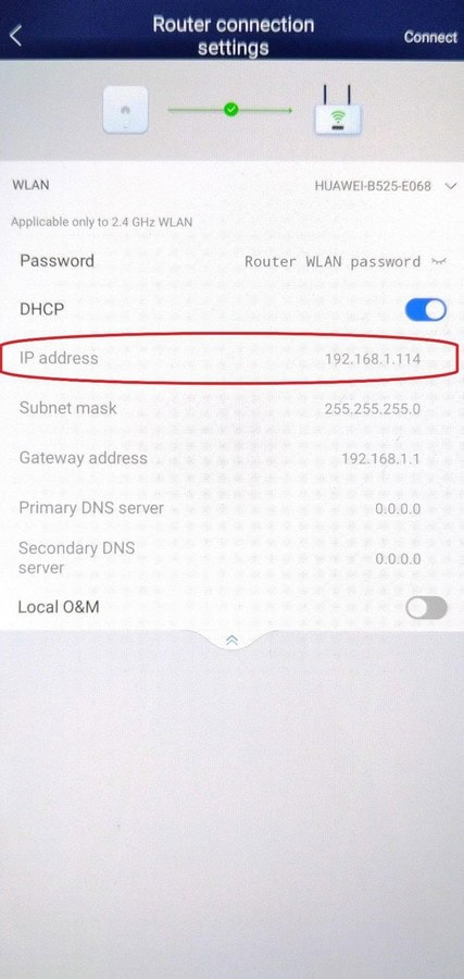 – meniul Services / Commission Device si conectare locala la invertorul Huawei SUN2000 utilizand parola de acces a invertorului pentru nivelul Instalator (installer)