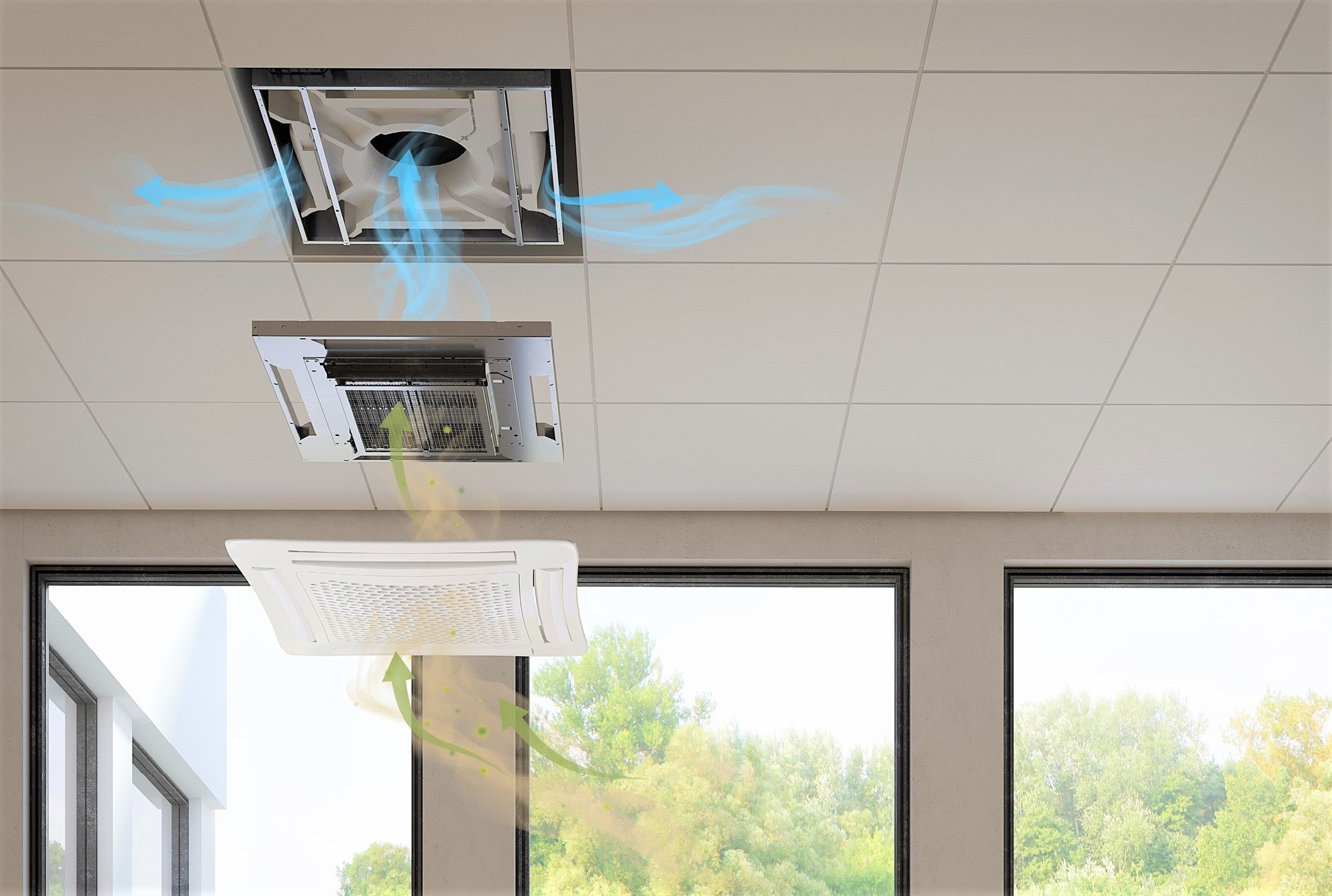 Acelasi echipament este folosit pentru incalzire, racire sau pentru ventilarea spatiilor prevazute cu ferestre sau usi mari.